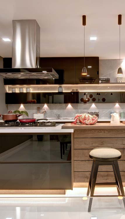 We offer modular kitchen designs for flat (apartment), or villas anywhere in India as per client’s requirements. Customized modular kitchen designs suits the client's lifestyle and fits perfectly in the space. An experienced interior designer from D’LIFE visits the site, takes measurements and understands requirements through several discussions. Our designer incorporates client’s requirements into suitable design as per shape and size of the kitchen. Once the client is completely satisfied with the drawings and specifications, the company produces a modular kitchen from its own factory. A team of experienced technicians perform installation on site with perfect coordination. This professional interior design company can execute a work within 35-40 days of finalization of drawings. Below are the 5 most popular types of modular kitchen designs by D’LIFE home interiors.